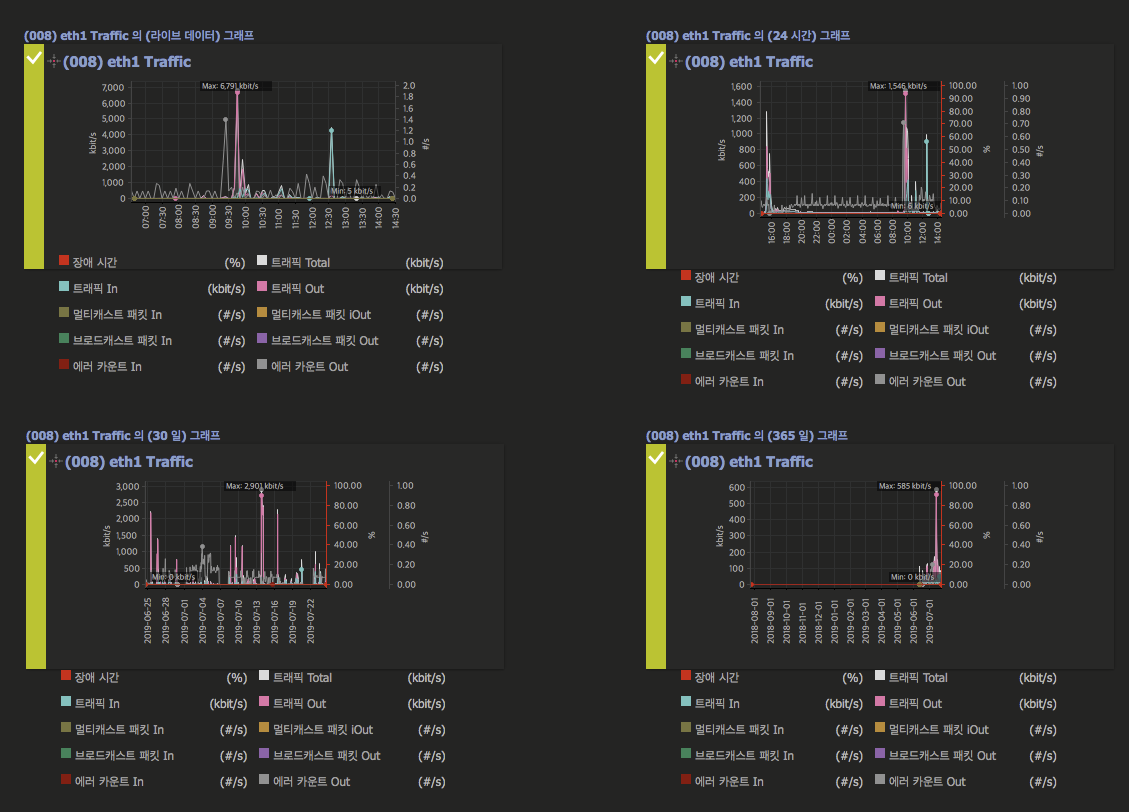 간단한 대시보드 화면 구성을 통해 직관적으로 그래프 현황을 보고 튀는 그래프 영역 또는 다운 상태를 감지하고 있습니다.