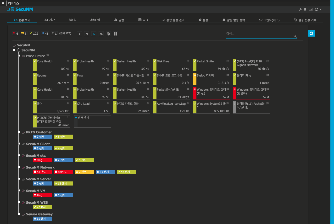 PRTG - 웹 인터페이스 구조(그룹/디바이스 우측, 인덱스 그래프 뷰)