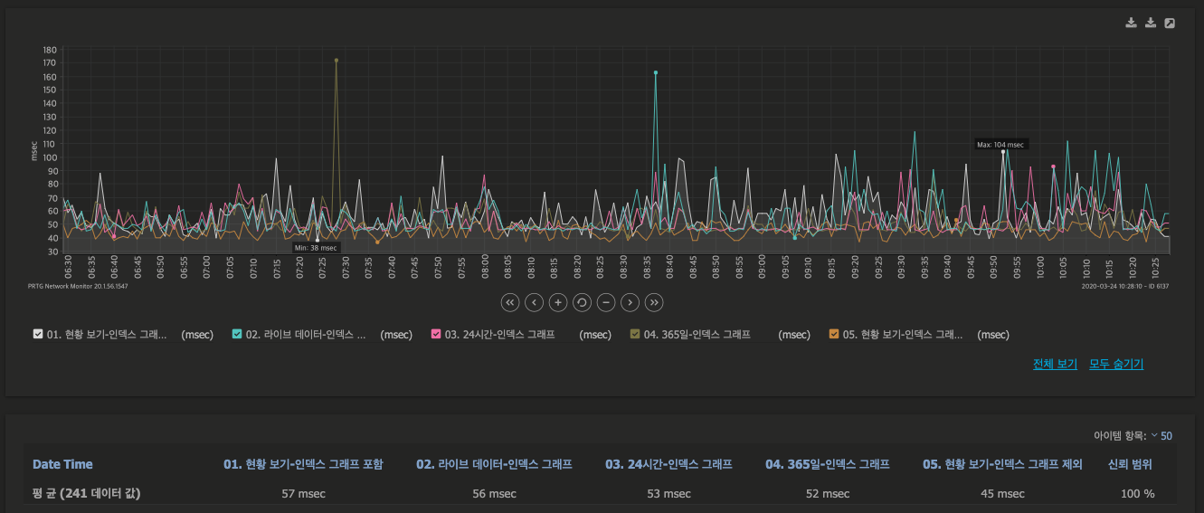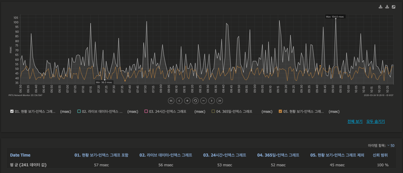 하단의 PRTG의 [그룹] 최상단 루트 상의 웹서비스의 로딩 그래프를 보면, 인덱스 그래프의 유/무의 웹페이지의 로딩 속도의 차이를 알 수 있습니다.