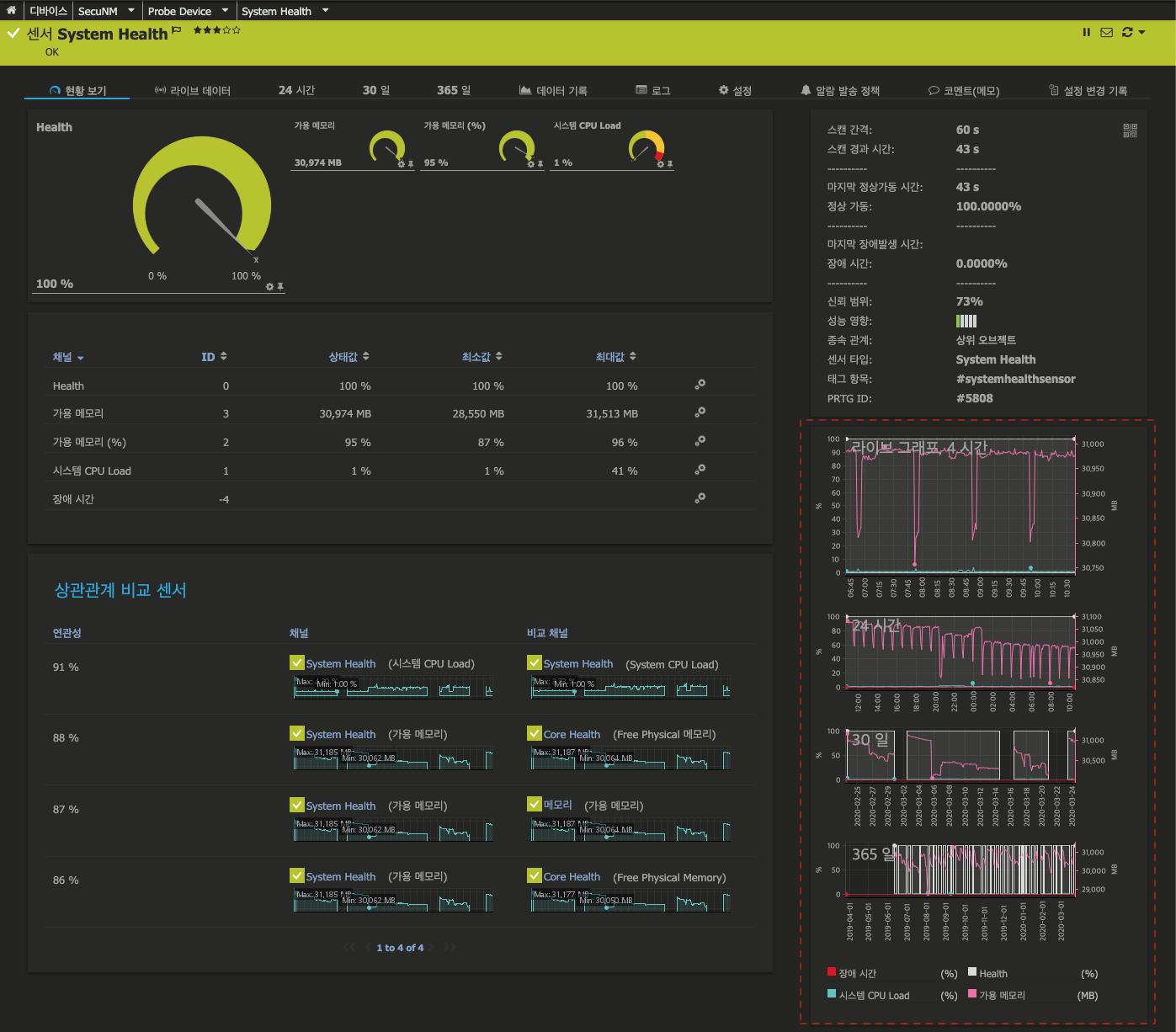 PRTG - 웹 인터페이스 구조(그룹/디바이스 우측, 인덱스 그래프 뷰)