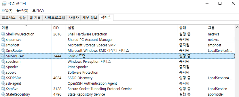 Windows 10 1809 / 1903 이전부터 SNMP 서비스를 활용한 사용자라면, 프로그림 및 기능에서 보이지 않더라도 [서비스]에서 활성화 되어 있으니 문제 될 일이 없습니다.